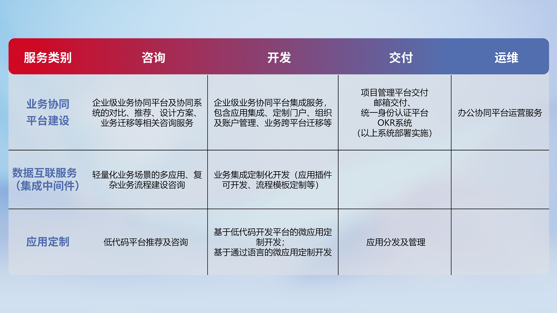 针对钉钉、、企微、、、IDaas等平台级产品提供产品的规划、、、、方案、、、交付、、、定制化开发等服务,,实现如统一协同办公、、智能客户服务、、、、混合会议管理、、、智能数据查询、、等业务场景,,实现数字化转型。。。