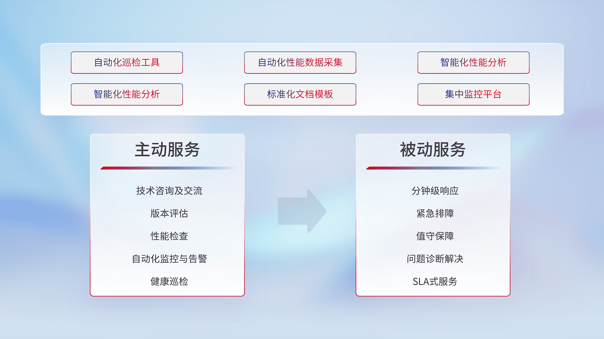 智能化工具和标准化文档,,,,保障服务质量,,提供主动服务(包含技术咨询、、、、版本评估、、性能检查、、、自动化监控与告警、、、、健康巡检)和被动服务包含(分钟级响应、、紧急排障、、、、值守保障、、、、问题诊断解决、、SLA服务)。。。